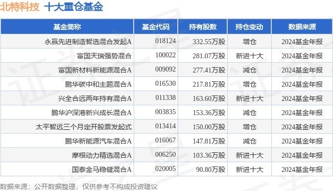 持有北特科技最多的基金为永赢先进制造智选混合发起A,目前规模为2.14亿元,最新净值1.9838(2月28日),较上一交易日下跌7.55%,近一年上涨107.58%。该基金现任基金经理为张璐。